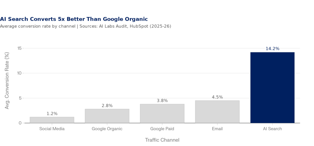 The reason is conversion quality. AI-referred traffic converts at 14.2% — roughly five times the 2.8% rate of Google organic traffic, according to AI Labs Audit data from 2025. When an AI engine recommends your brand, the user has already gone through a filtering, comparison, and synthesis process that a traditional SERP never completes for them. They arrive pre-sold. AI platforms generated 1.13 billion referral visits in June 2025 (a +357% year-over-year increase). This channel is small, fast-growing, and disproportionately valuable.