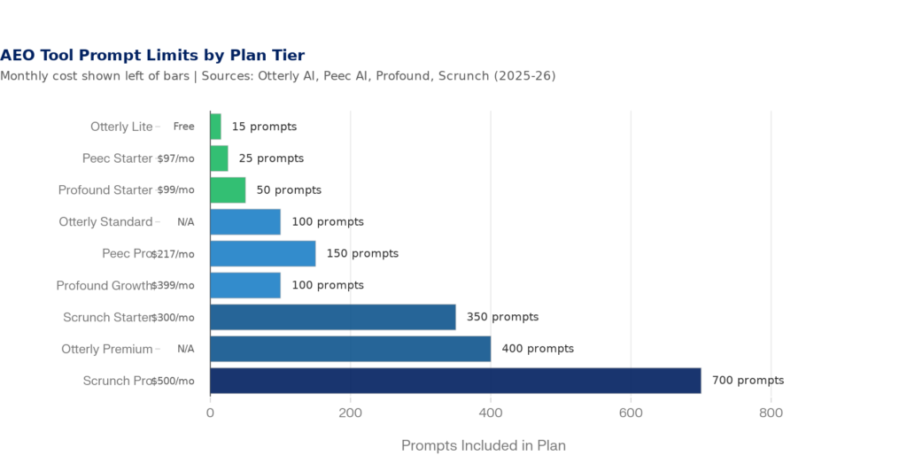 Otterly AI’s Lite plan gives you 15 prompts. Profound’s Starter tier gives you 50. Peec AI’s entry plan offers 25. Scrunch’s starter begins at 350 — but across 7 platforms, that’s effectively 50 unique questions. The per-prompt-per-platform math eats your budget fast.