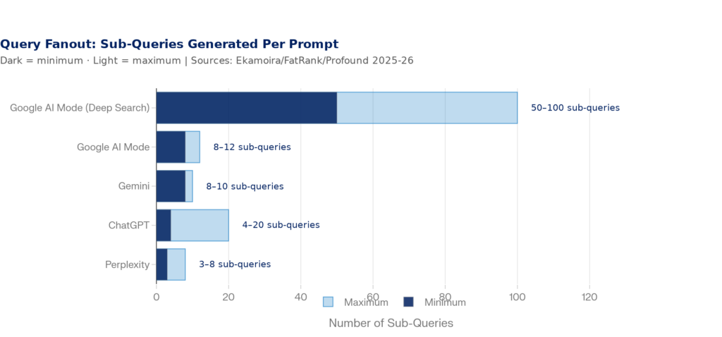 On top of that, AI systems don’t actually search for the prompt you type. They use a process called query fanout where your original question gets decomposed into 4–20 parallel sub-queries that each pull separate content. Google AI Mode generates 8–12 sub-queries for standard queries and can spin up hundreds for Deep Search. ChatGPT averages 2.17 searches per prompt. Gemini fires off 8–10. Each of those sub-queries is a potential citation opportunity, and most brands aren’t thinking about them.