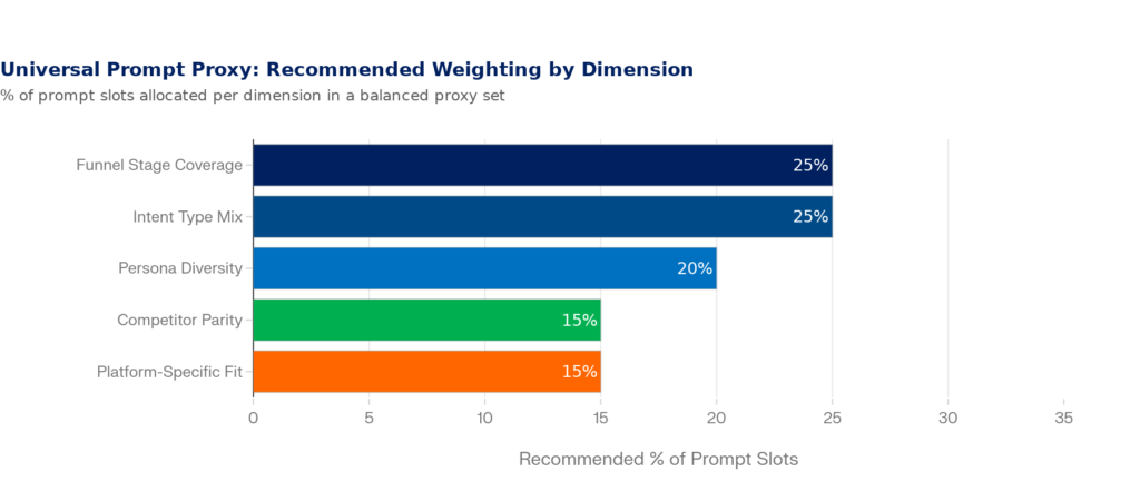 A universal prompt proxy is the smallest set of carefully selected, representative prompts that collectively reflect the full diversity of how your audience actually queries AI systems about your category, product, and brand.