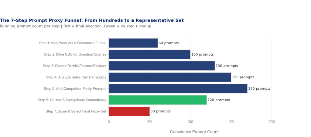 Week 3Apply semantic clustering to deduplicate; add competitor parity prompts; score and prioritizeFinal 50–100 proxy set with priority scores