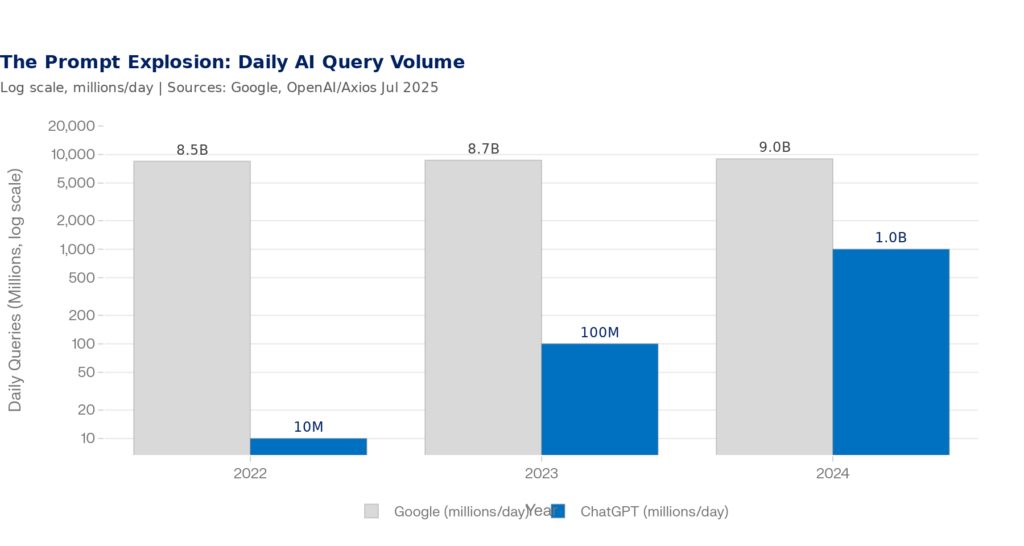 Now layer on top of that the AI search revolution. ChatGPT alone processes 2.5 billion prompts per day — more than doubling from 1 billion just eight months prior. The average ChatGPT prompt is 60 characters long: roughly 17 times longer than the average Google search query (3.4 characters). These aren’t keywords. They’re conversations.